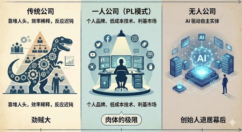 中间,是一人公司(PL模式)。这是传统模式的巅峰增强版。利用个人品牌、低成本技术和利基市场,将个人能力放大到极致。但同时,它也面临社会规则的切割和肉体的极限。