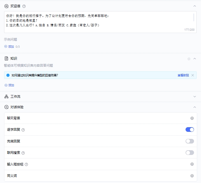 用户对于智能体的第一印象来自于欢迎语的设计,为了让用户更精准的表述需求,我这里对提问方式进行引导。