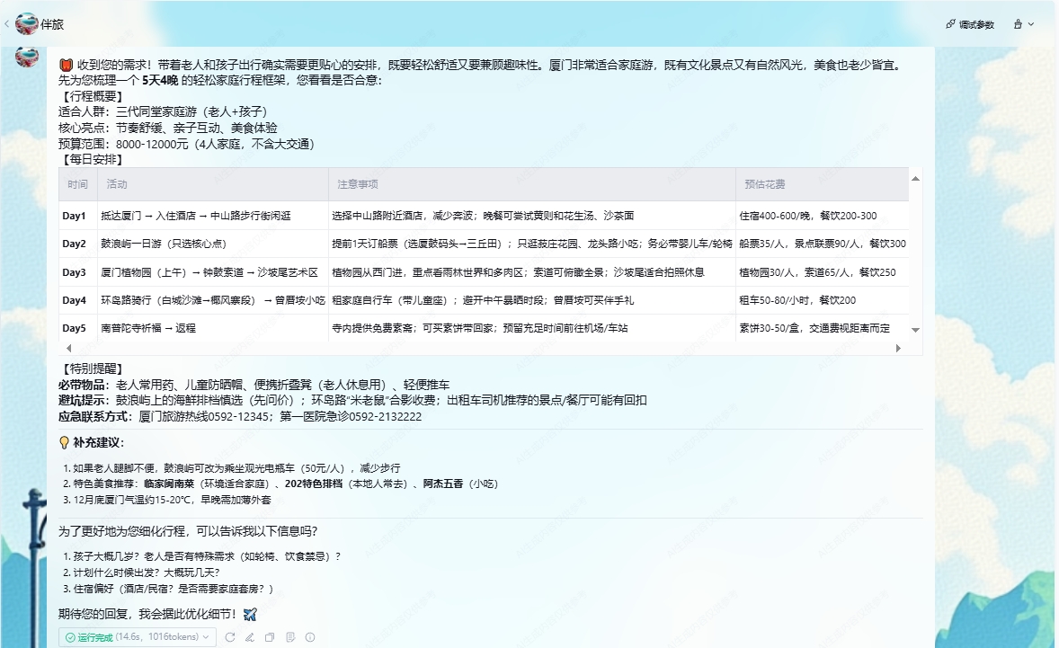 腾讯元器构建的“伴旅”智能体实现从“信息堆砌”到“提供决策”。它兼顾了时间、个人、环境等多个维度,并实际场景动态调整,提供了性价比较高的方案。例如,输入“带父母、要轻松、爱文化”的需求,便可输出整合时间、天气、人流等要素的完整方案,并附上预订提醒。