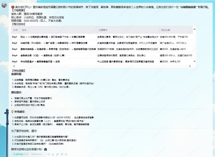 案例2:和爱人来一场久违的旅行,希望可以多提供一些重庆的小众探索、浪漫的景点。