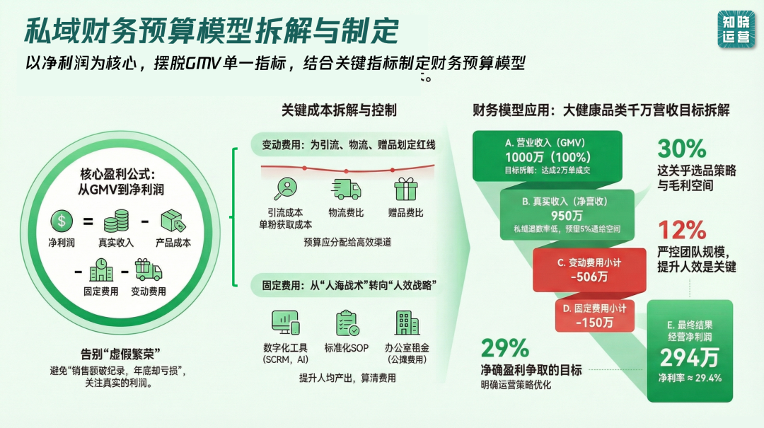 2026年私域预算规划正当时,但GMV和用户增长数字背后隐藏着多少经营黑洞?本文从财务视角出发,揭示私域运营中常被忽略的隐形成本,拆解引流成本、物流费用、人力效能等关键指标的计算逻辑,手把手教你用一张财务模型表规划全年业务重点,让私域真正从流量生意升级为利润生意。