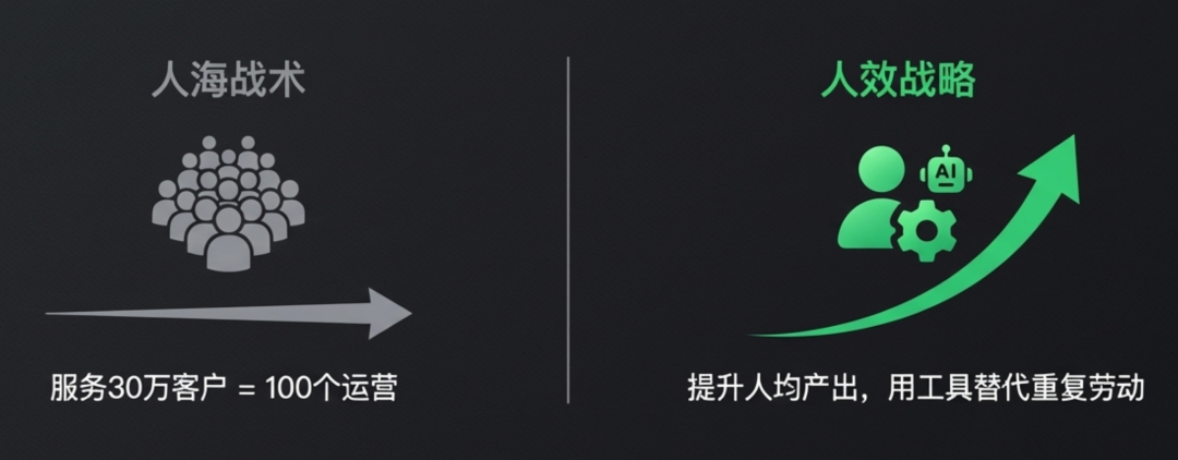 一个运营服务3000个客户,要服务30万客户就招100个人,那这种线性增长的逻辑,现在的人力成本下是不可持续的。