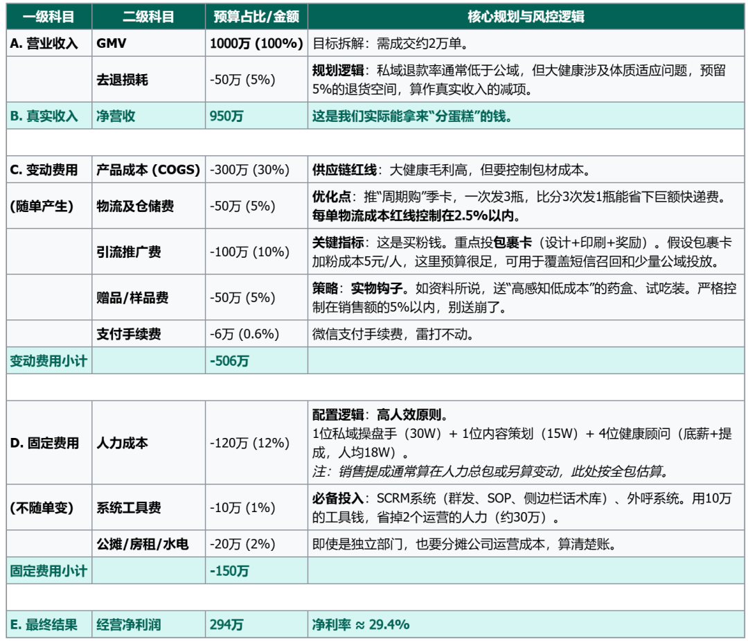 下面我们以大健康品类,如益生菌单年私域千万目标为例,来梳理这个财务表格该如何规划与落地: