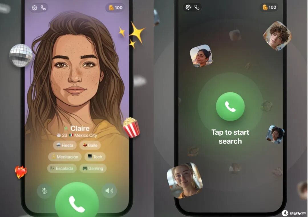 在具体功能上,Z Chat的玩法则比较简单——主打纯语音聊天,进入应用后只需要点击搜索匹配,然后系统就会给用户推荐兴趣、年龄相匹配的人,无需左右滑动。在推荐页上,会显示用户的头像、姓名、国家以及兴趣标签,最下方则只有拨打电话、调节音量以及静音按键,和手机电话的形式类似,基本没有理解和使用成本。