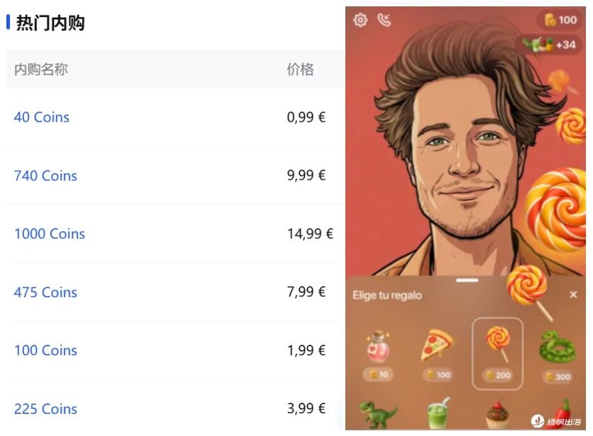 提到收入,Z Chat的变现模式相对同类型应用也比较单一:没有对通话方面做出限制,而是主要集中在送礼功能上,用户可以充值金币购买各种虚拟礼物,赠送给其他用户。内购金币礼包最低为40 Coins/0.99欧元,1000 Coins则为14.99欧元。对比而言,礼物最低价为10金币,其次则从100到800美元不等。