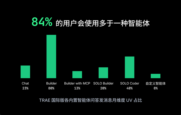 TRAE 的数据能把这种变化量化:中国版每 10 位开发者有 3 位在用 SOLO,国际版 SOLO 累计渗透率达 44%。57%的中国版用户、84%的国际版用户会混用多种智能体;一年里有 36.5 万个自定义智能体被创建,1.1 万个 MCP 工具被接入。
