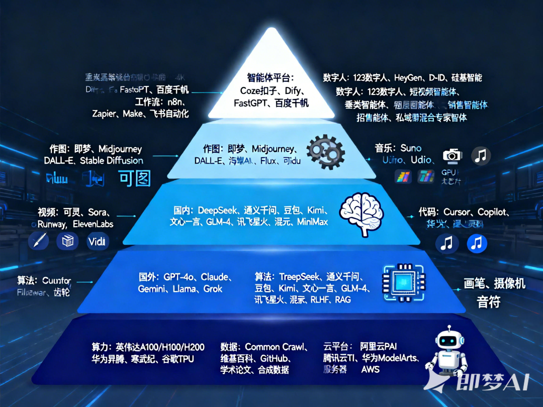 再往上一层呢,叫垂直应用大模型,比如做图的即梦、MJ、nano,做视频的可灵、Sora,做音乐的suno,这一层就相当于工具,有的专门作图,有的专做视频。