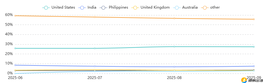 (2025年6-9月,AI播客片段生成器赛道主要国家/地区的流量占比趋势)