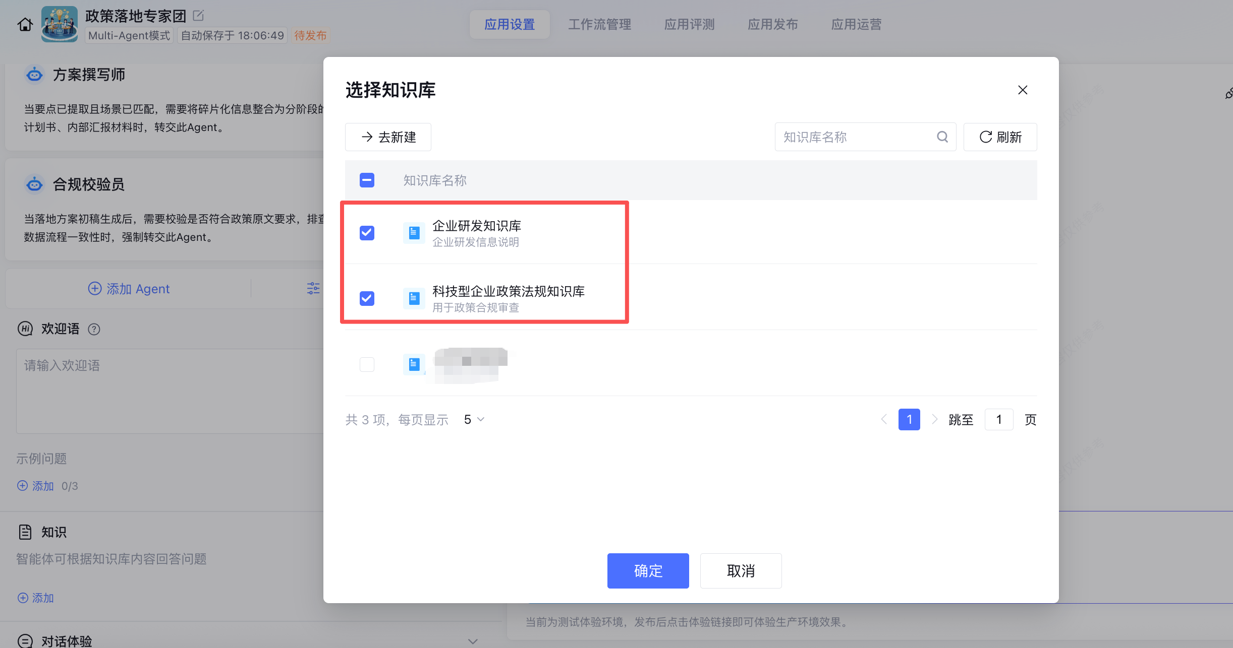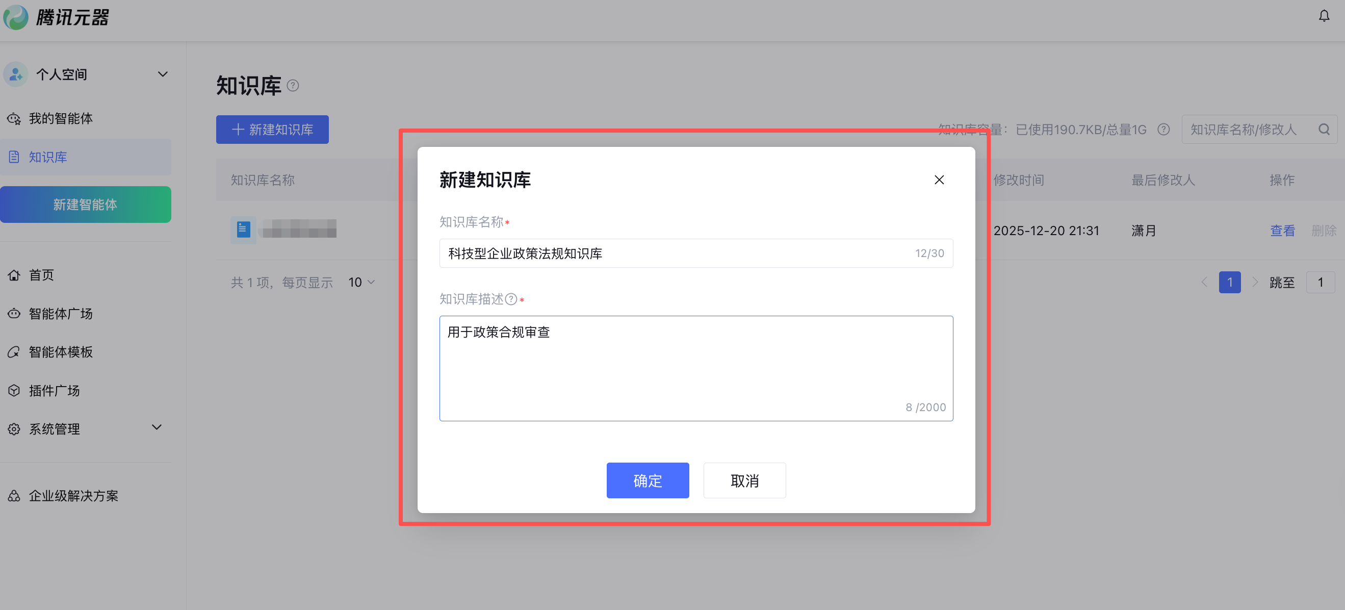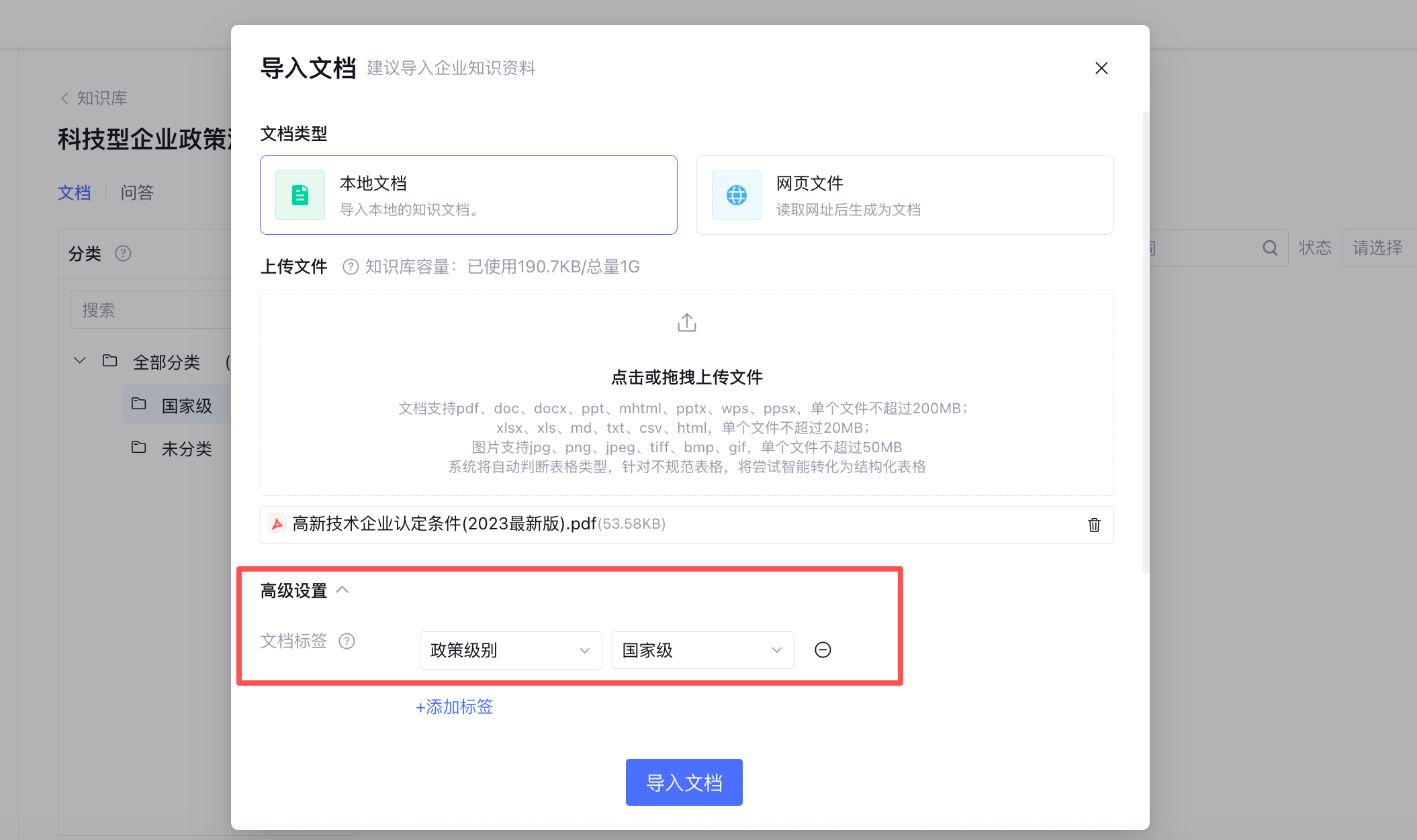 - 上传文件:新建知识库,上传《高新技术企业认定管理办法》、《国家重点研发计划管理暂行办法》等国家及地方政府政策文件。