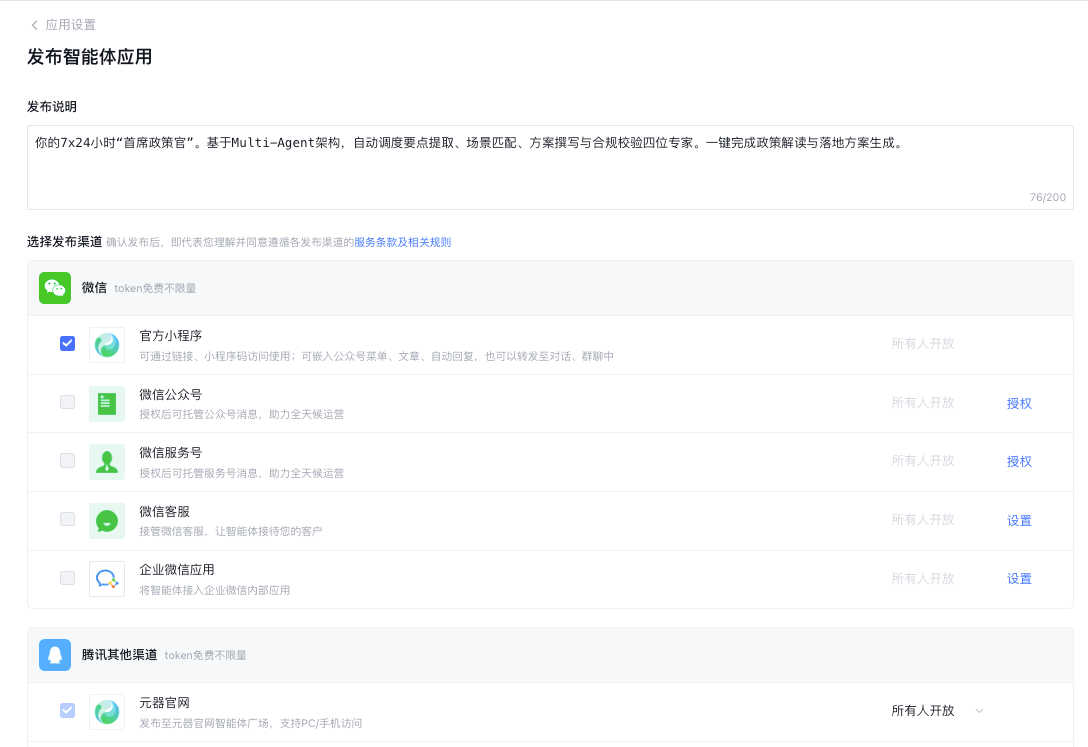 1.智能体调试满意后,点击右上角“发布”,在腾讯元器的发布设置里,支持微信等多个渠道(如官方小程序,微信公众号,微信服务号)。
