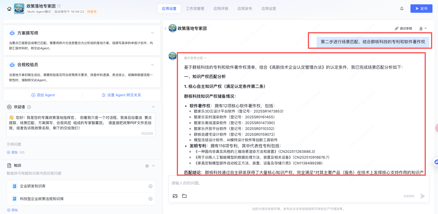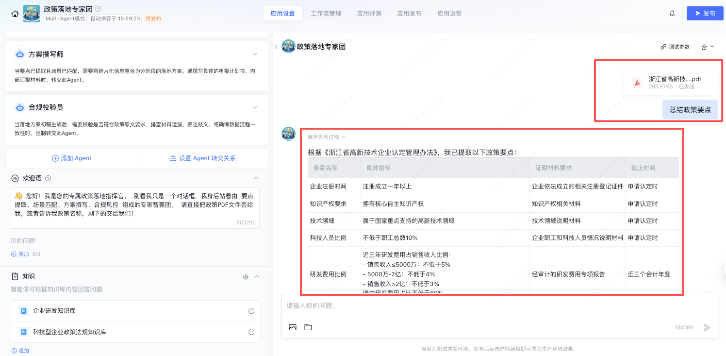 搭建完成后,我们开始调试我们的智能体。我们上传了一份《浙江省高新技术企业认定管理办法》的PDF文件。