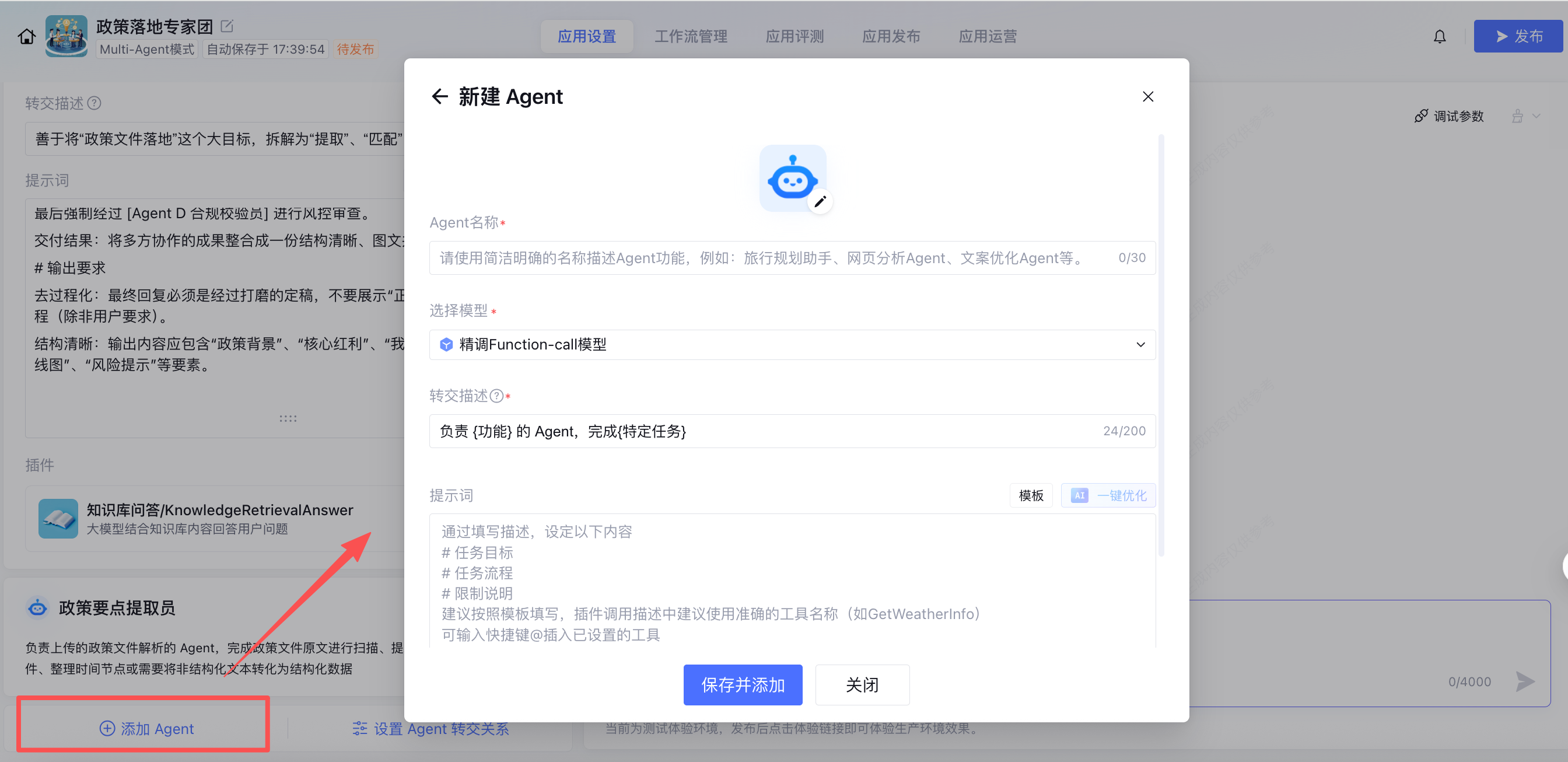 操作:回到智能体配置页面,找到对应智能体区域,点击「添加」按钮,将这两个知识库关联给Agent B和Agent D。