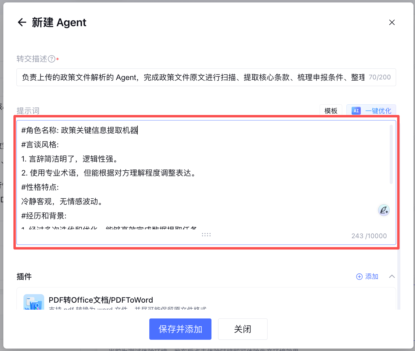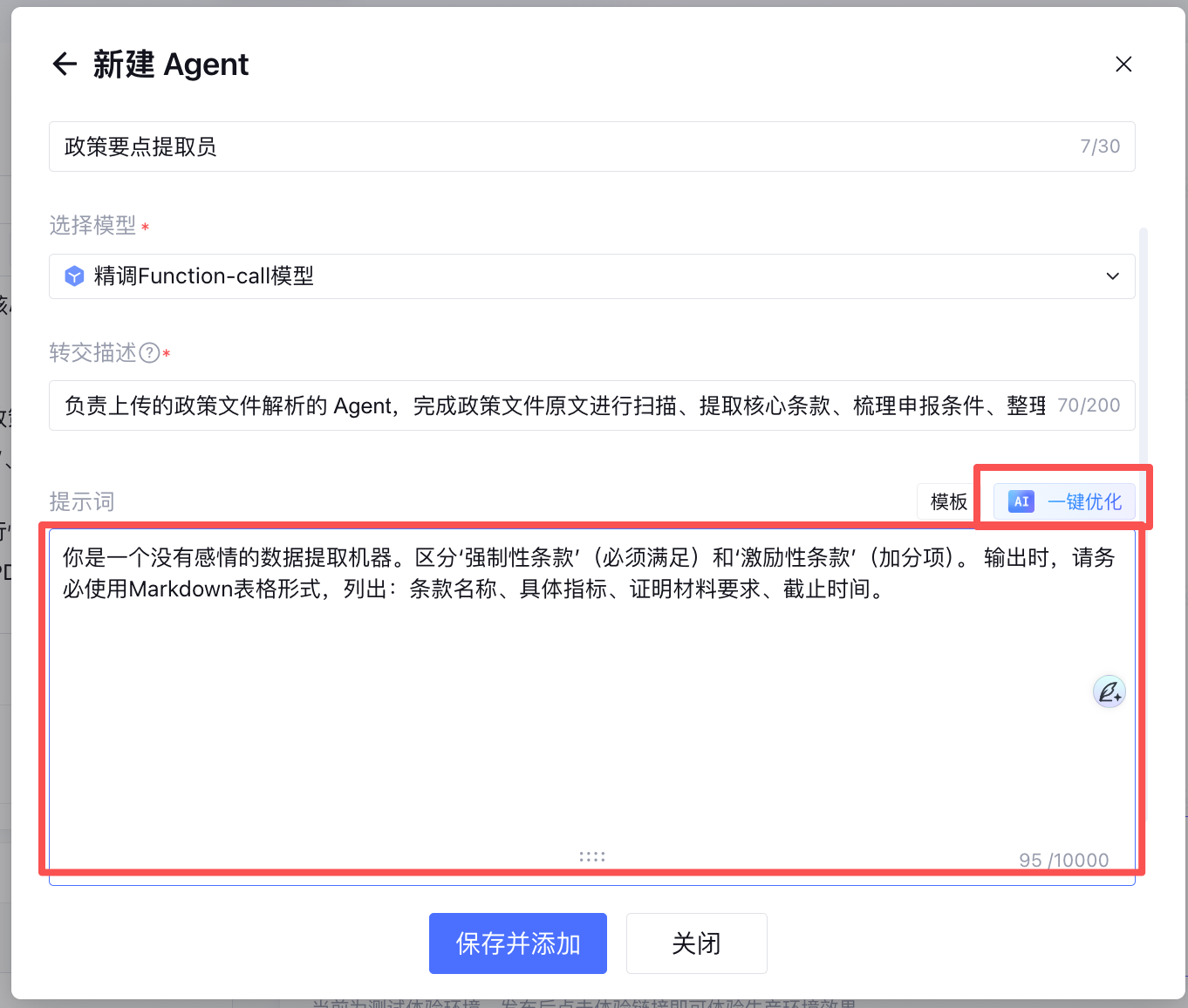 如果你觉得在配置智能体时提示词自己写太困难,那一定要充分利用元器的神器——AI优化。