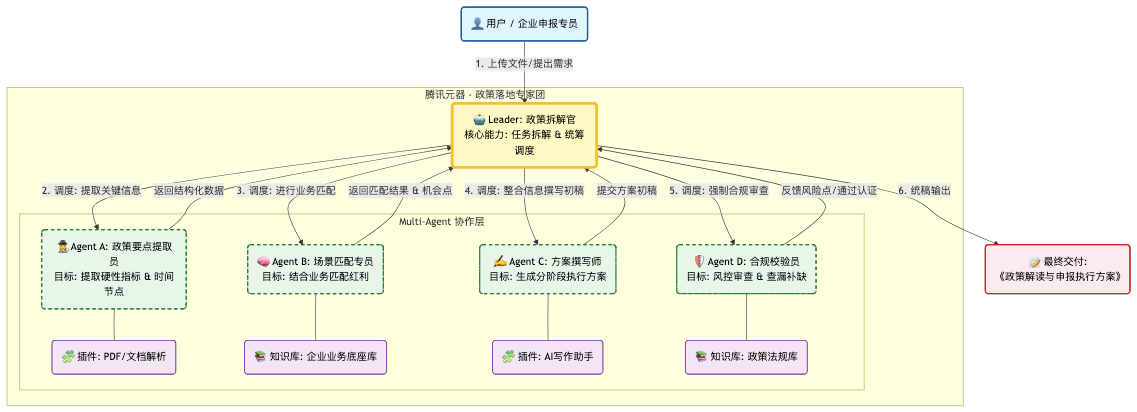 政策申报的繁琐流程让无数企业行政人抓狂——从解读晦涩文件到匹配业务场景,每一步都暗藏合规陷阱。腾讯元器的Multi-Agent架构正为此而生,通过搭建政策拆解官、要点提取员、场景匹配专员等AI角色组成的数字智囊团,实现从政策解读到落地方案的全流程自动化。本文将揭秘如何用这套系统精准捕获政策红利,让企业告别手动‘考古’时代。