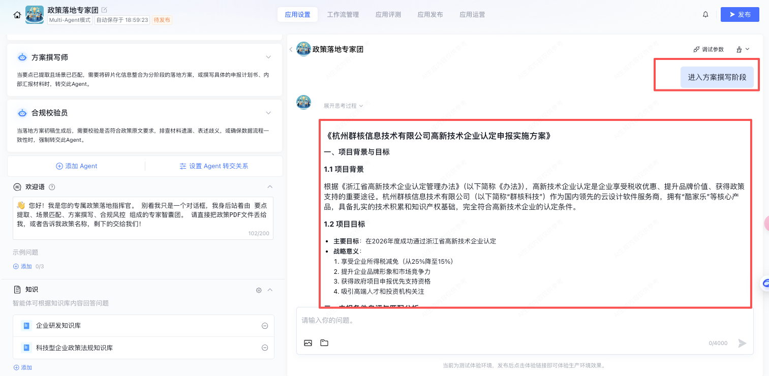 5)Agent C(方案撰写师)生成初稿: “正在撰写《杭州群核信息技术有限公司高新技术企业认定申报实施方案》