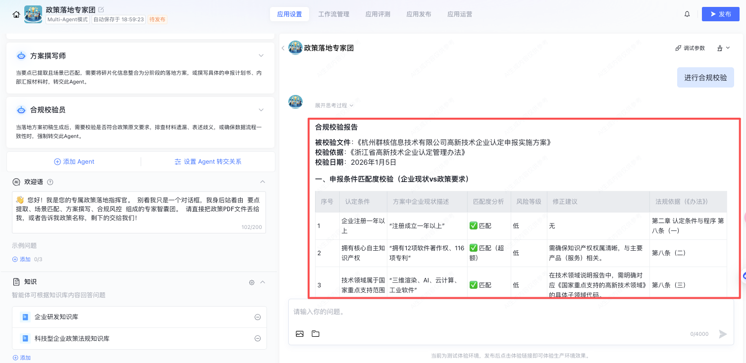- Agent D(合规校验员):负责“踩刹车”。他是铁面判官,挂载了《政策法规库》知识库,专门检查方案有没有违规风险。