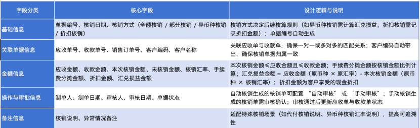 核销单是确认“应收单-收款单”匹配关系的核心单据,需精准记录核销逻辑与金额,字段(含UML)设计如下: