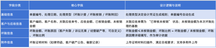 坏账处理单用于记录坏账计提、核销、转回的业务,需满足会计准则与内控要求,字段设计如下: