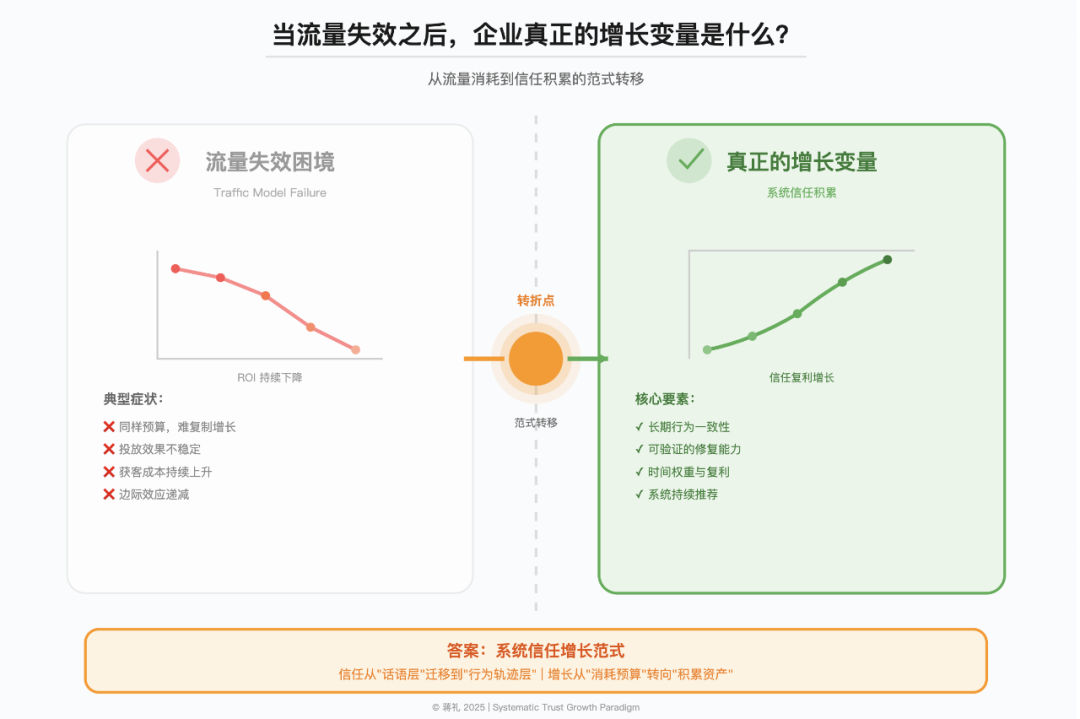 在流量红利消退的时代,企业增长逻辑正在发生根本性转变。最新提出的「系统信任增长范式」揭示了数字商业的新规则:信任不再是主观感受,而是由长期行为一致性构建的系统变量。本文通过完美日记、海底捞等典型案例,深度剖析为何可验证的行为轨迹比短期流量技巧更能驱动持续增长,以及企业如何在这场信任革命中抢占先机。