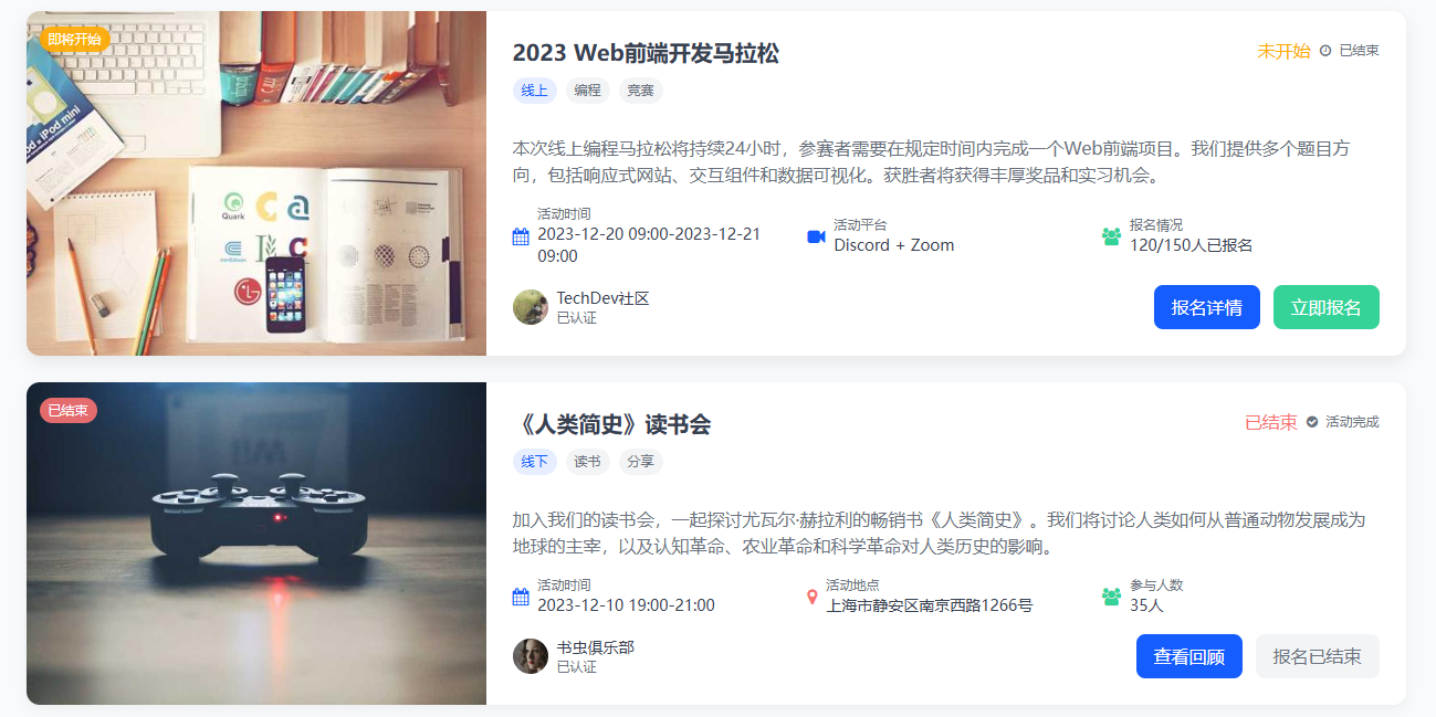 - 每条活动右下角,显示操作按钮,按钮文案-色块:报名详情-蓝色;查看回顾-蓝色;立即报名-绿色;报名已结束-灰色;报名已结束-灰色。