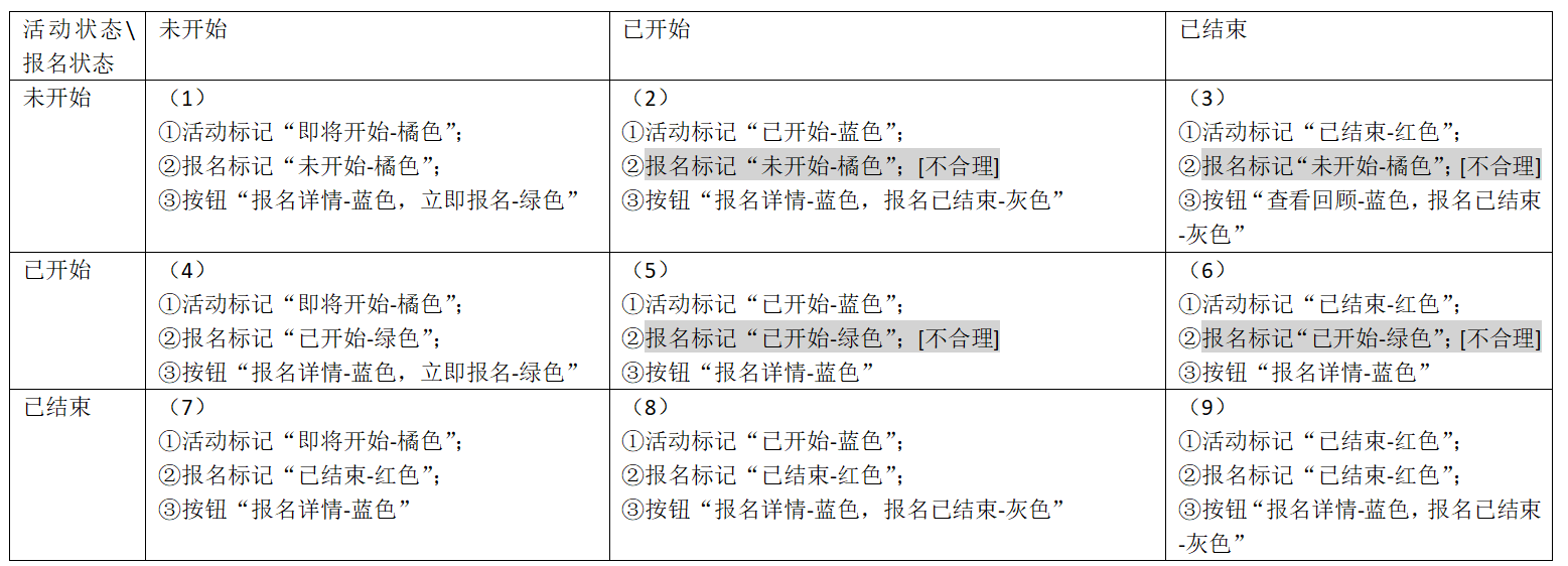 点(2):活动已开始或已结束,按“报名阶段必在活动开始时间”前的业务规则,此两种活动状态下,不存在数据的报名状态是“未开始、已开始”。