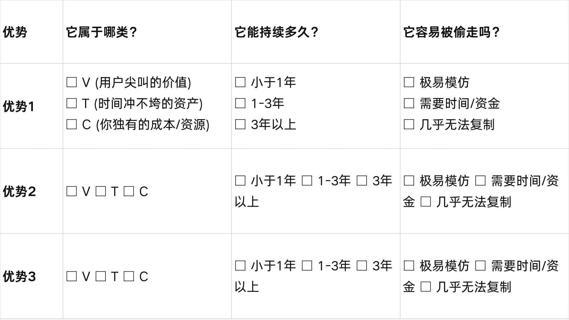 先别想“护城河”。请诚实地、按优先级写下你现在最大的三个业务优势。