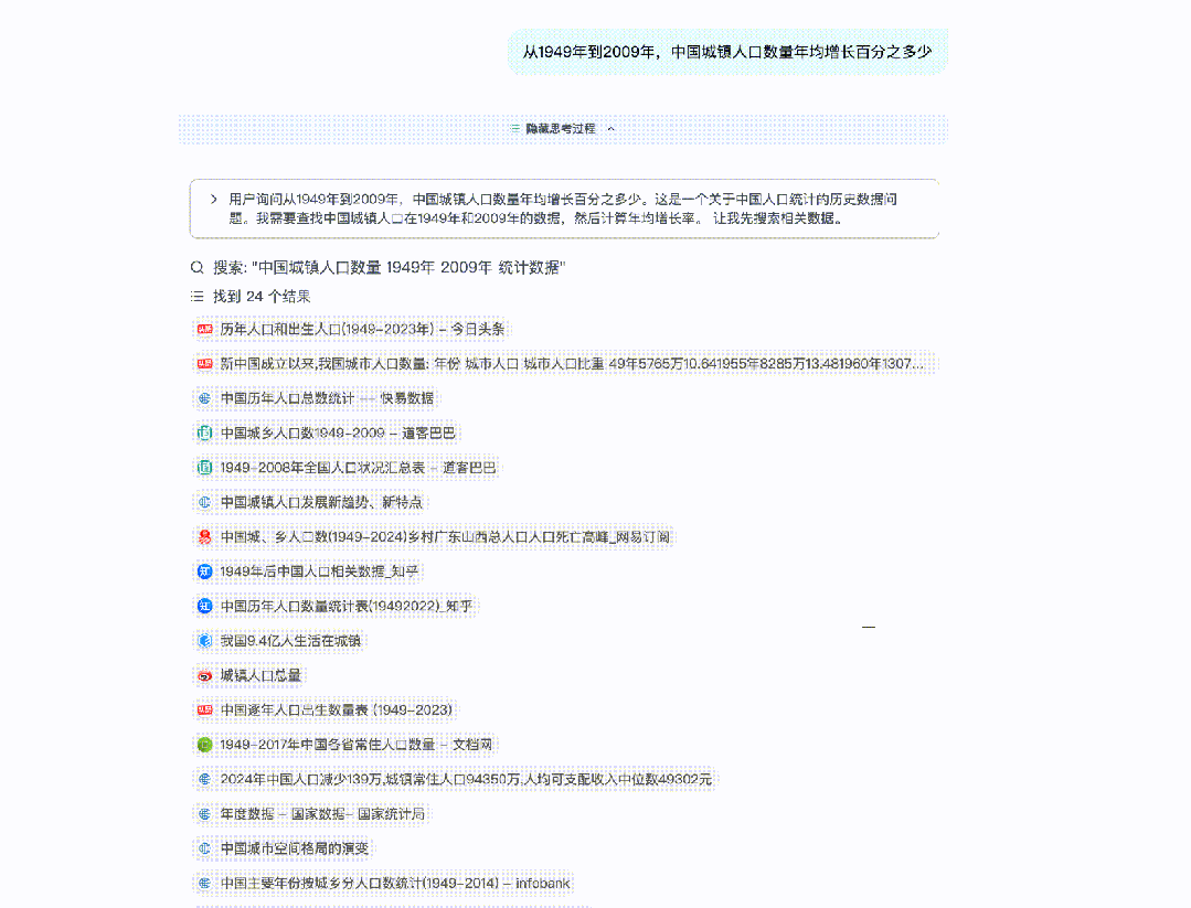我花了相当长时间测试MiroThinker 1.5的实际表现,选了一个需要跨时间数据分析的问题:”从1949年到2009年,中国城镇人口数量年均增长百分之多少?”这个问题特别有意思,因为它需要模型找到可靠的历史统计数据,理解年均增长率的计算方法,还要确保数据源的权威性。