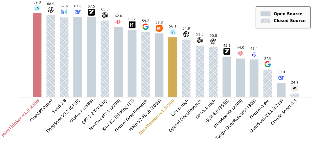 当然,实际体验只是一方面,更客观的评价还是要看基准测试。MiroThinker 1.5在多个权威基准测试中的表现都达到了全球第一梯队水平。