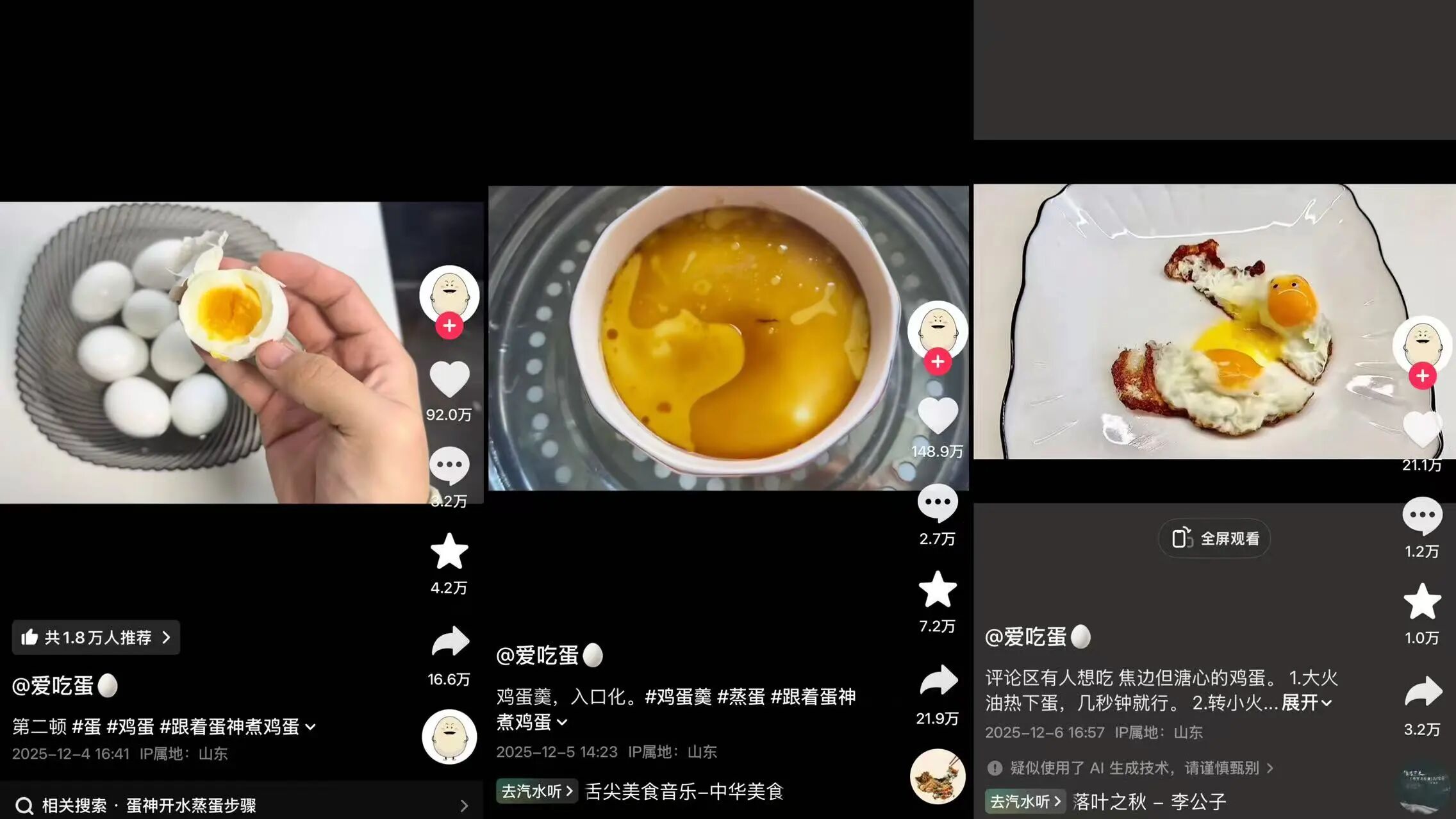 趁着这波热度,@爱吃蛋 于12月4日首次发布作品,完整复刻了“9分12秒”的煮蛋教程,两条视频总获赞超过150W。其后,他又陆续发布了蒸鸡蛋、煎鸡蛋、鸡蛋饼等朴实无华的视频教程,均收获了积极反馈,相关事迹还被央视频转发报道。一众网友在评论区和他虔诚“取经”、在平台中晒出模仿视频之余,@爱吃蛋 的热度也不断走高,账号开启了飞速涨粉模式。流量巅峰时,其账号粉丝超435万。