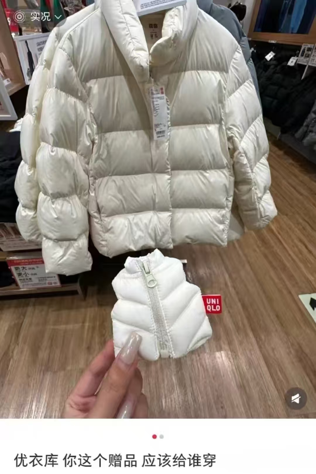 不知道大家有没有印象,羽绒服的吊牌上经常会附带一个透明小包,里面是羽绒。类似明厨亮灶,让消费者看清原材料,作为品质背书。这件缩小版的羽绒服可以起到类似的作用。