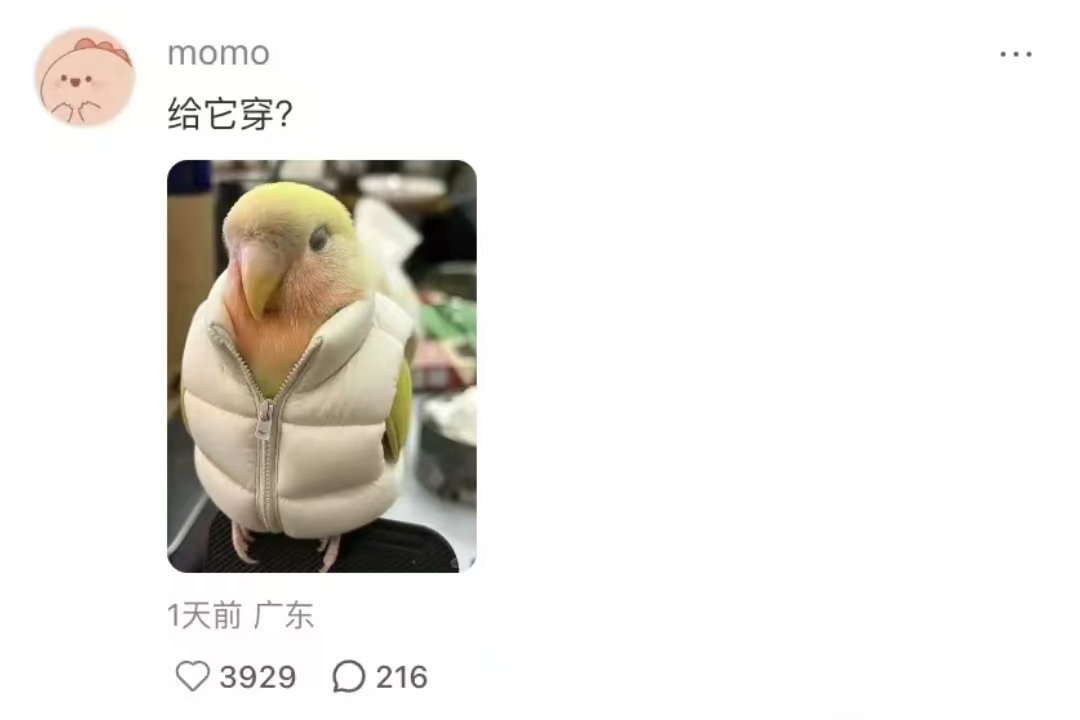 当然远不止于此,评论区让我们看到了更多的可能性。比如这位网友就把小羽绒服给了鹦鹉穿,和主人同款,瞬间搭上了宠物经济。