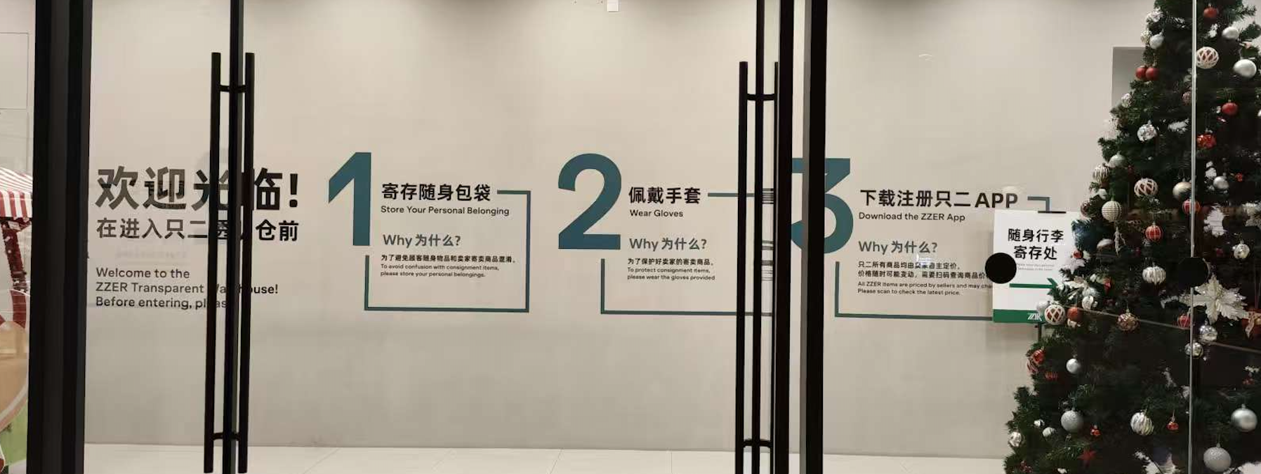 透过玻璃窗看到里面是一排排货架,很像仓储式商超。仔细看发现是一家二手奢侈品店。一进门的白墙就用三步走的方式描述了进店环节,且文案有仔细斟酌,不仅有关键动作,还解释了Why?让消费者更能接受,且透露出店铺的细心。