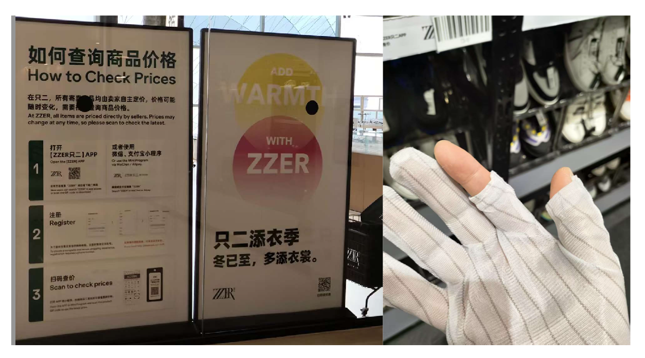 货架上的所有商品都没有标注价格,需要手机扫码查询。手套露出了食指和拇指,这个很容易想明白,是为了方便点击手机屏幕,只能算设计细节,不是重点。