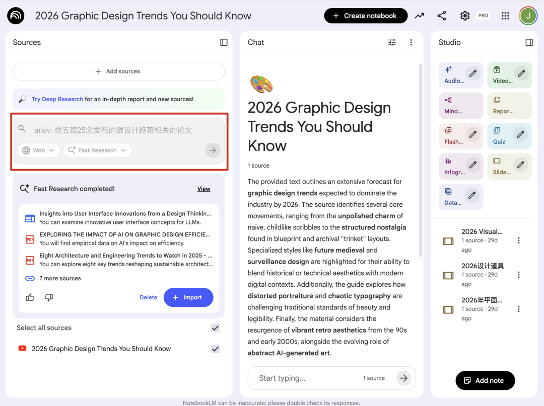 Fast Reserach不要直接问“2026设计趋势”,这样就跟我搜索引擎搜十个相关但没啥意义的网页放进来一个样,要加上指定信源,比方说arxiv,yt,google scholar