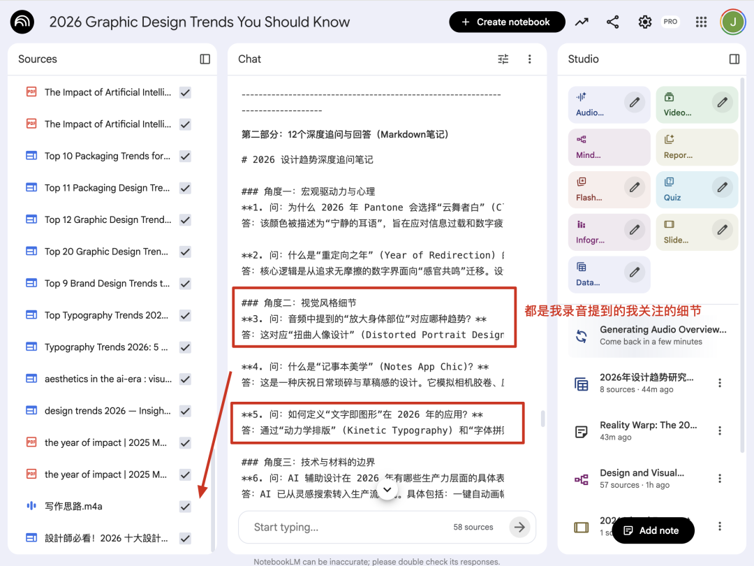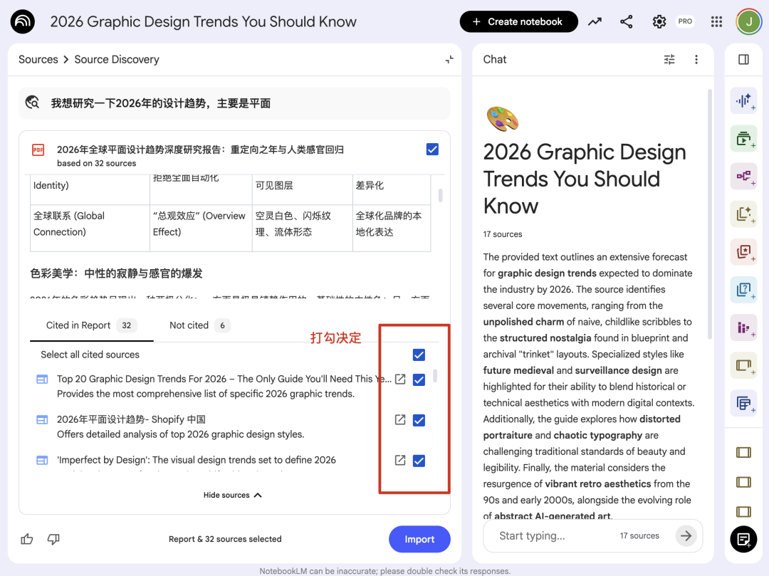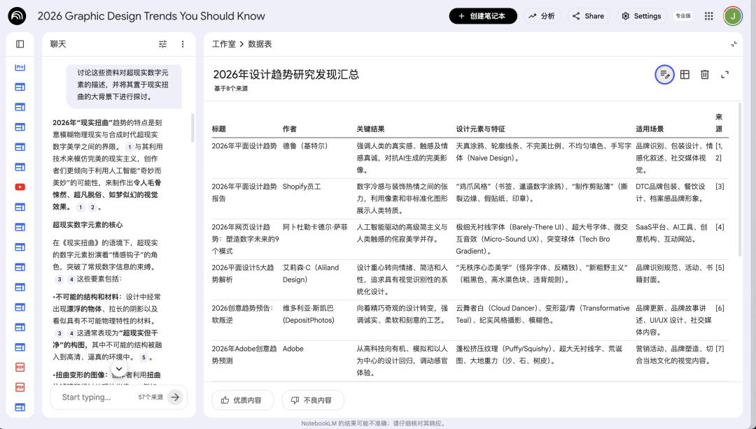 这时候可以用两种方法来把可信度高的信息源收录到NotebookLM,我就拿我最近做的2026设计趋势调查的笔记来说明一下。