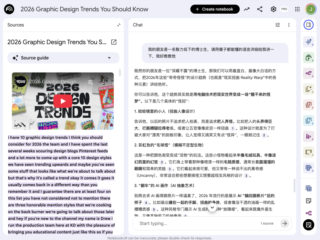 我个人的习惯是先导入音频,视频类需要多模态信息读取的文件,跟NotebookLM简单聊几句,确认它真的看到了视频内容,而不是网页的文本信息。
