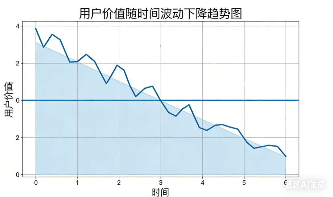 如果用图形展示用户价值和其需求成长性的关系,可看下图,下图展示了一个用户价值不断衰减产品,图中阴影部分即为其全生命周期价值。