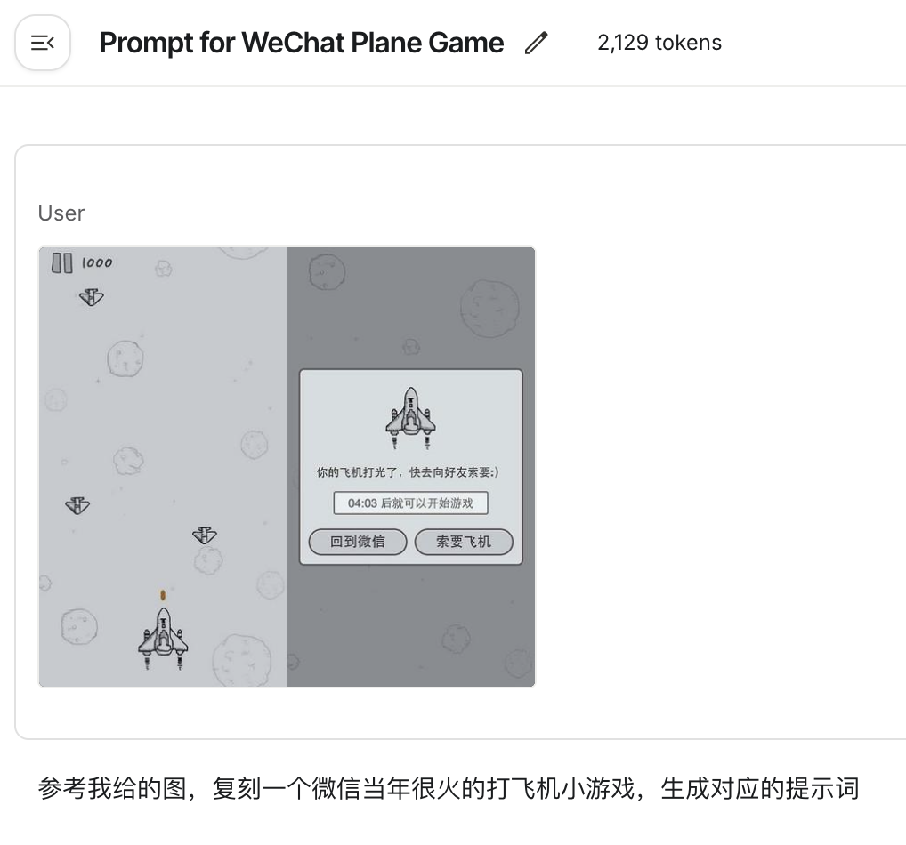 我去网上找了一张当年打飞机的游戏截图,然后写了一句提示词:参考我给的图,复刻一个微信当年很火的打飞机小游戏,生成对应的提示词。