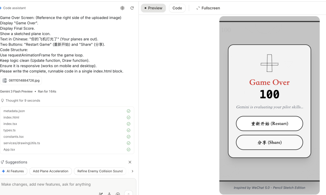 把上一步给到的提示词,贴进build中,很快Gemini就给我出了第一版,其实已经可以正常玩了,但也发现有一些问题。