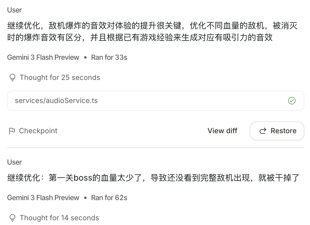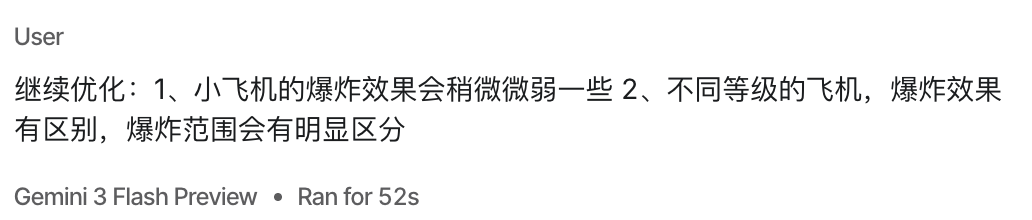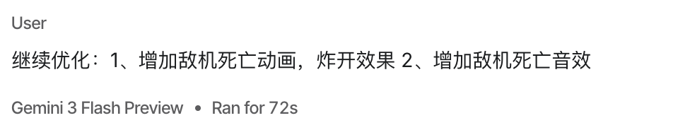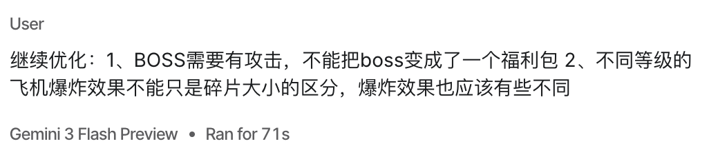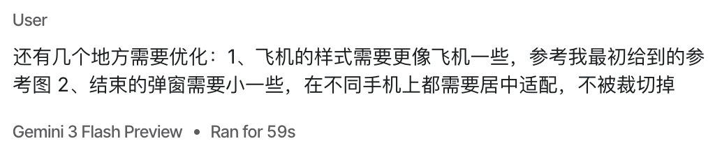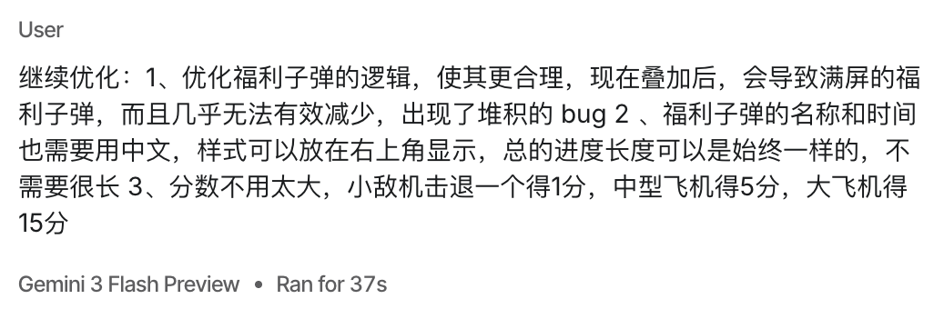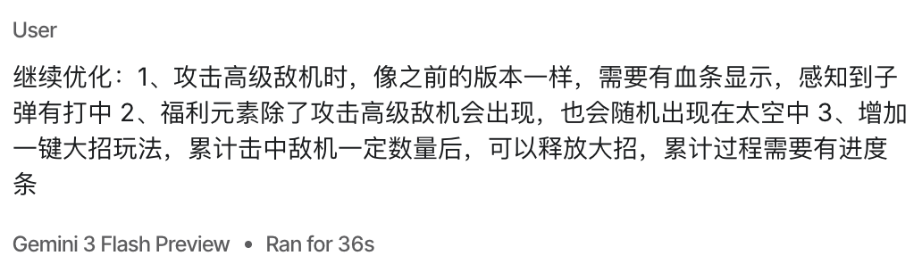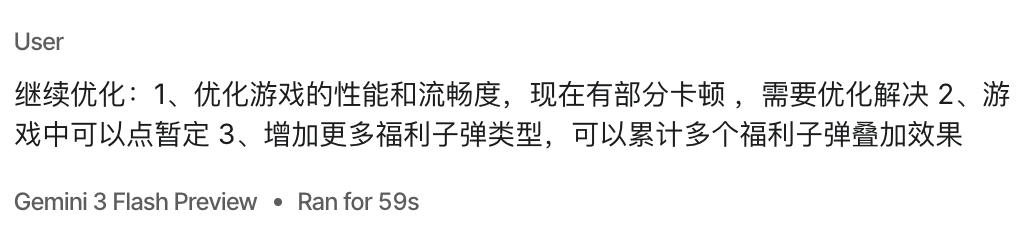 因为我希望是能在手机上玩,所以兼容是必须要考虑的;其次,不能有太多英文提示,咱们用户看不懂;一些没必要的元素需要去掉;音效对游戏的体验来说非常关键。这几个都是第一版的大问题,直接按问题列给Gemini即可。