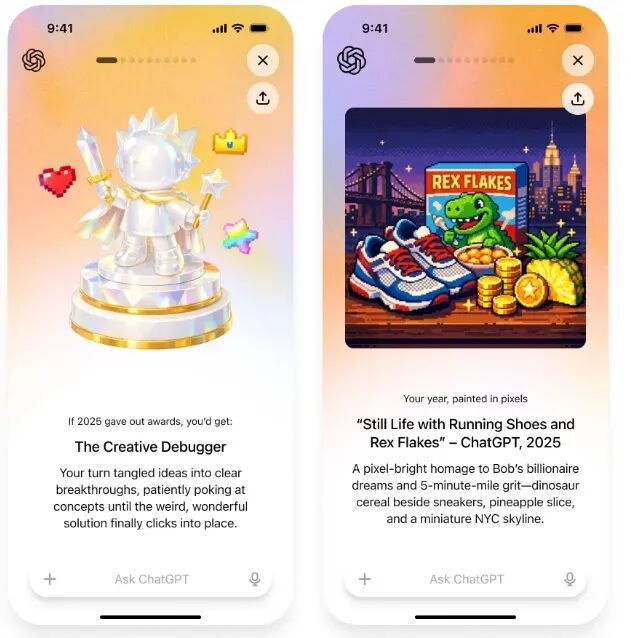 案例 1 ChatGPT 推出年度回顾功能,把用户一整年的 AI 对话,转化为可视化数据、AI 人格画像与定制诗歌: