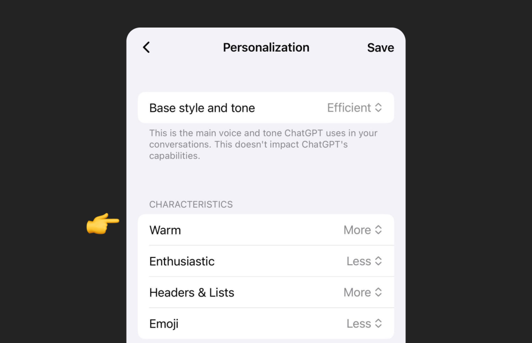 案例 3 ChatGPT 推出多维度人格参数调节滑块,通过档位化控制实现交互风格精准适配,标志 AI 对话系统从统一输出转向用户主导的个性化体验设计: