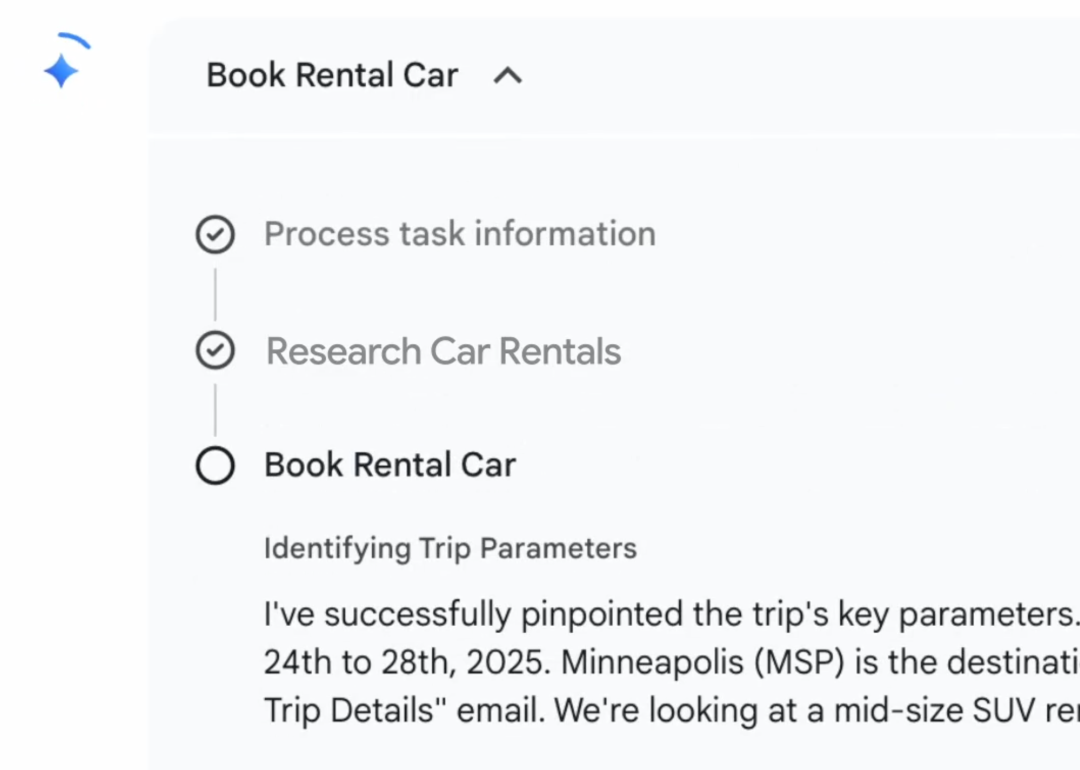 案例 1 Gemini Agent 租车功能上线,支持自动比价、读取邮箱以及租车服务的预订,AI 正在尝试进入端到端的生活服务制定阶段: