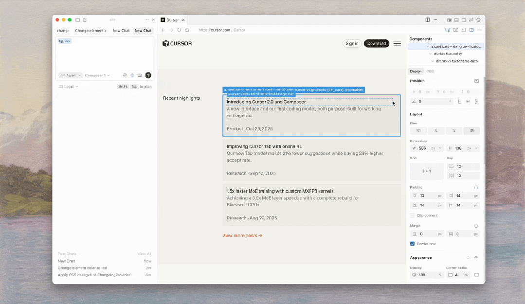 案例 3 Cursor 为 Cursor Browser 推出全新可视化编辑器,把网页、代码与视觉编辑工具整合到同一窗口,可拖拽调整界面、直接查看组件属性与样式,用自然语言指令快速修改并自动同步到底层代码: