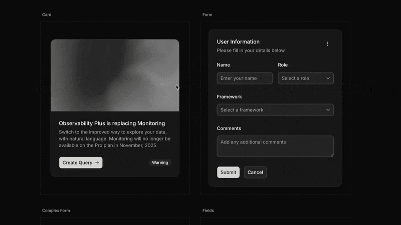 案例 3 知名组件库 shadcn 推出 shadcn create,提供可视化方式自定义基础组件的结构、间距、字体与风格,并可一键在 Next、Vite、TanStack Start 中启动生成的主题,显著降低构建专属设计系统的门槛: