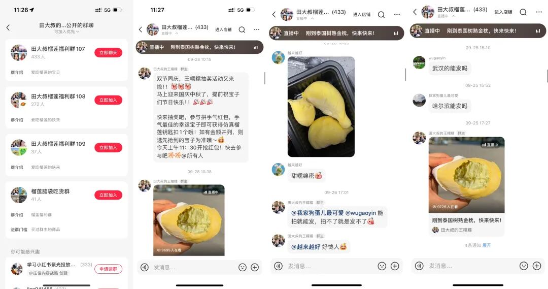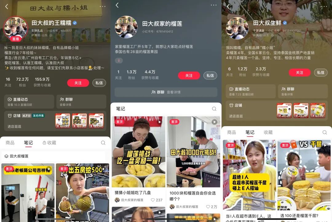 这内容山庄在搜索”田大叔“关键词时,看到他有找一些素人博主做种草和测评笔记,3个主账号的专业知识铺垫+直播产品展示拉近消费者距离+社群运营(榴莲吃法)+素人的真实内容。