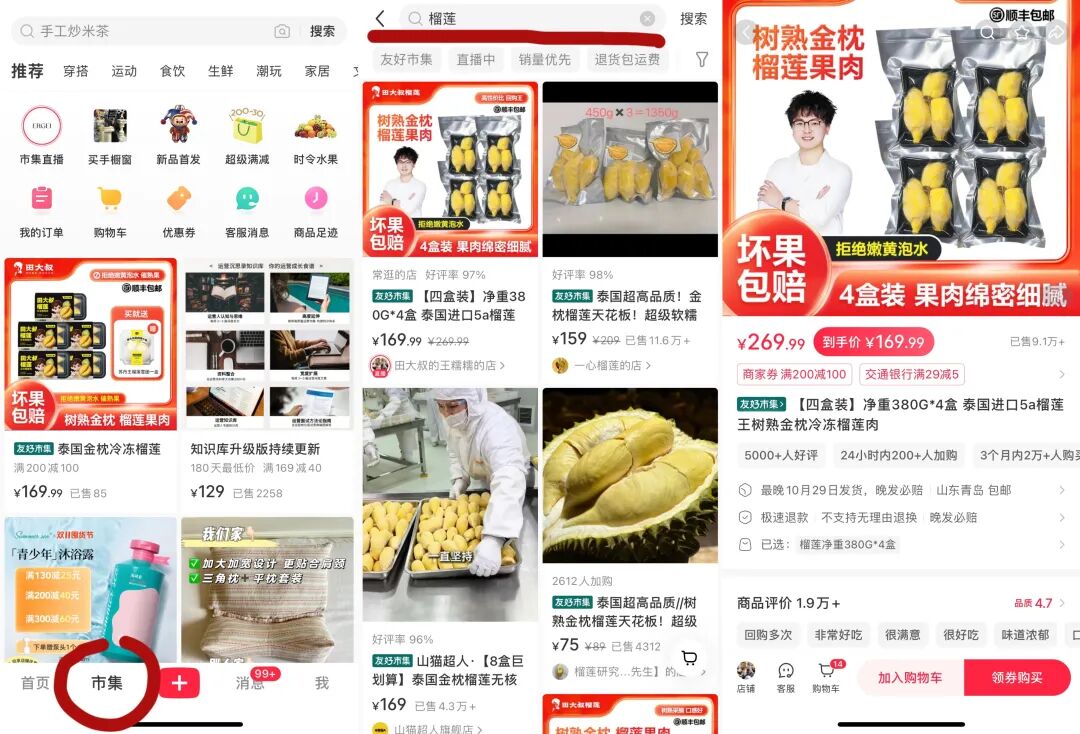 1. “种草-拔草”的极短链路:用户在刷笔记时被一张榴莲图“种草”,页面下方直接就能点进店铺或直播间“拔草”。这种“心动即行动”的闭环体验,极大地降低了消费决策门槛。