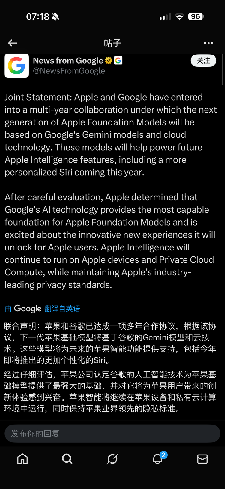 北京时间 1 月 13 日凌晨,苹果与谷歌联合发布声明,宣布达成一项多年期深度合作协议:下一代苹果基础模型(Apple Foundation Models)将基于 Google Gemini 模型和云技术构建,并为今年即将上线的个性化 Siri 提供核心技术支持。