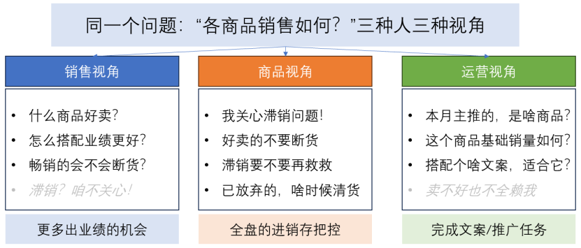 比如,同样看“各个商品销售情况”。销售部门、商品部门、运营部门处于不同目的,想看的重点会完全不同(如下图)。