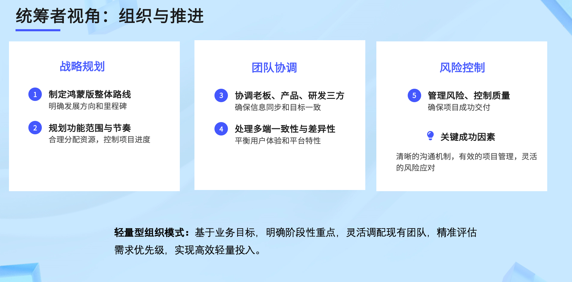 - 战略规划:制定鸿蒙版整体路线,明确发展方向与里程碑,规划功能范围与节奏,合理分配资源、控制项目进度。